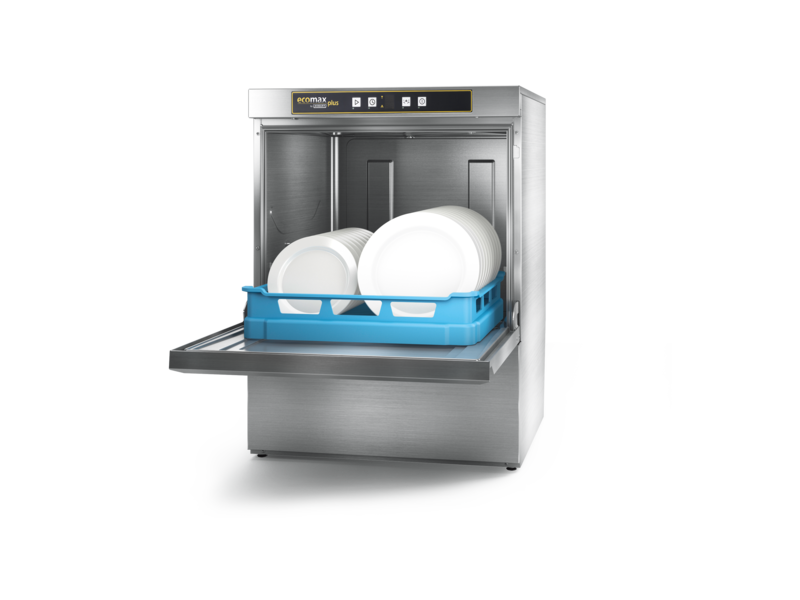 - Nominal capacity with double rack up to 80 racks/h (40 plate racks + 40 glass/cup racks)