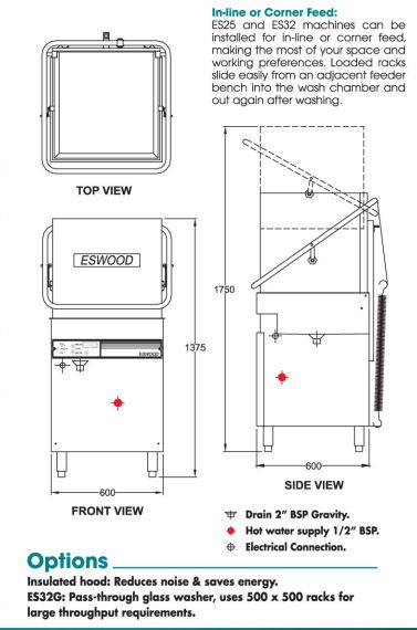 - ES25 - 1 Phase - 540 pieces per hour - Rinse pump fitted as standard.