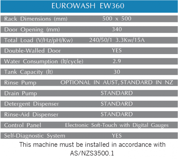 The Eurowash EW360 multi-function, Undercounter Dishwasher, delivers outstanding results even faster, through advanced design. Water consumption is restricted to only 2.9 litres/cycle, regardless of the total wash time, you save water, electricity, chemicals and money! The easily accessed, soft-touch controls puts at your fingertips, the power of three unique wash cycles handles light to the heaviest of workloads.